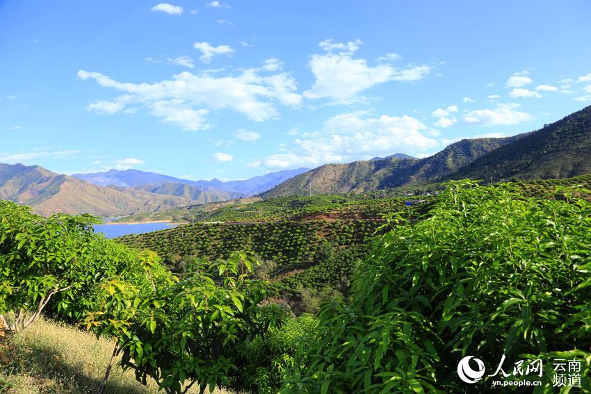 只见蓝天白云倒映在江面上,岸边江水清澈见底,从江边到后面的山坡上,种满了芒果树。虽然立冬已过,芒果早已采收完毕,但郁郁葱葱的芒果树,依然能嗅到一丝芒果飘香的痕迹。